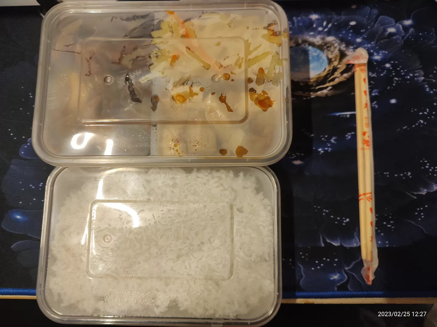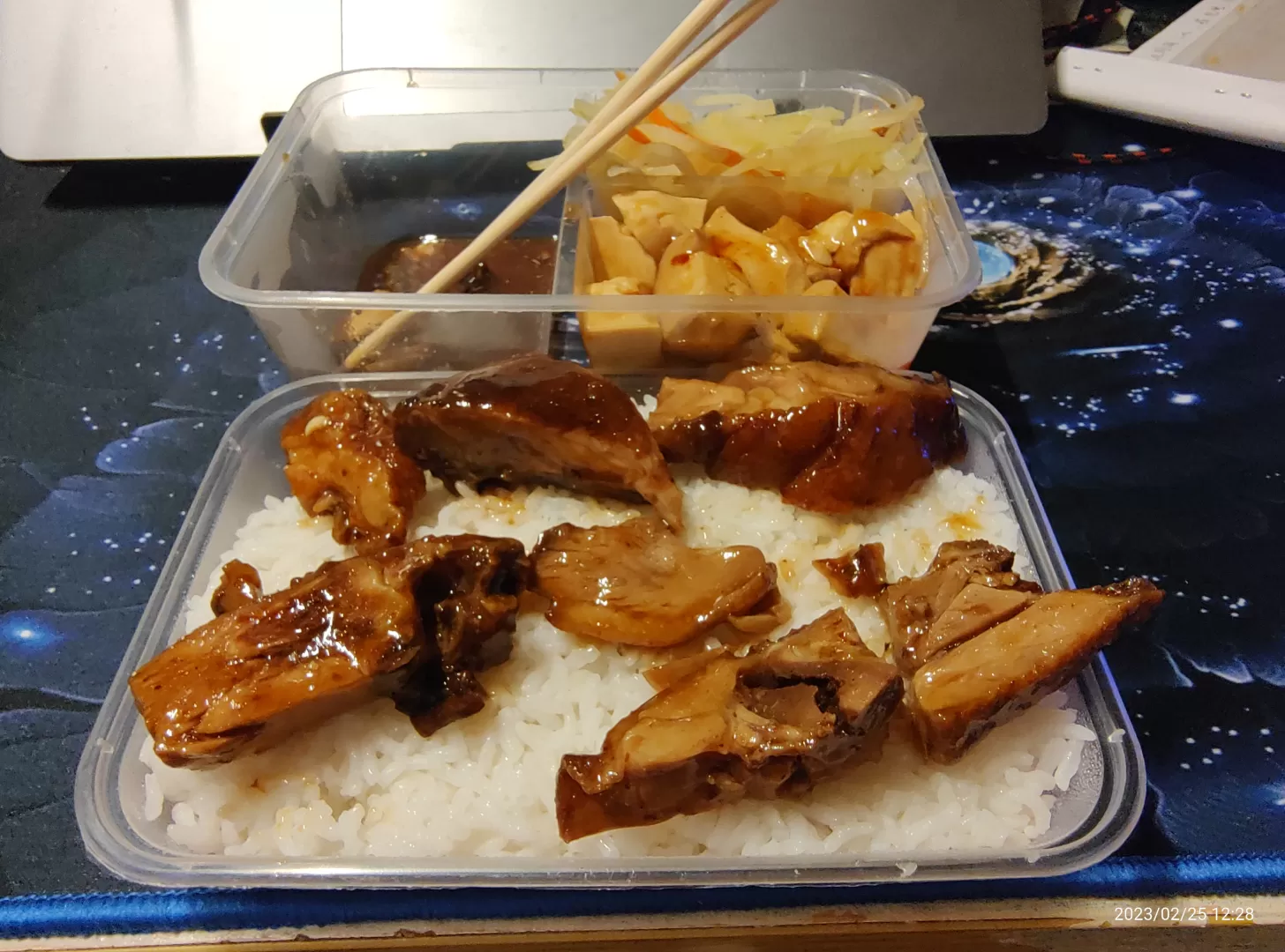 一荤加随机二素的组合,素菜是便宜但好吃的土豆和豆腐,店家做出来的成品味道挺不错的。都不辣,但是我喜欢吃带点辣的菜。